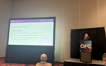在 OFC 2025 的最后一場(chǎng)會(huì)議上Janina Rautert 博士登臺(tái)介紹了我們?cè)诹孔狱c(diǎn)激光技術(shù)方面的最新進(jìn)展——這一次再次被選為享有盛譽(yù)的截止日期后論文會(huì)議。